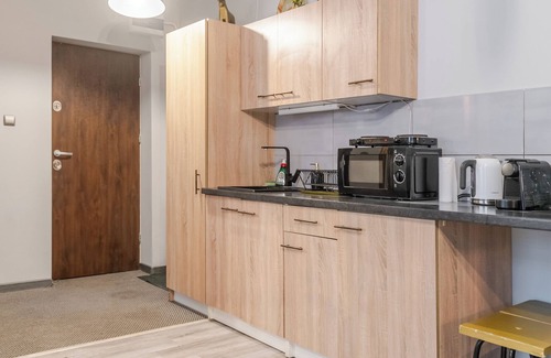 Strzelecka Central Studio consists of a living area with a fold-out sofa (chaise-style) and a king-size bed, a kitchenette, and a bathroom. The apartment is equipped with Wi-Fi, terrestrial television, a refrigerator with freezer, electric stove, microwave, kettle, and capsule coffee machine. Additional amenities include an iron, vacuum cleaner, and hairdryer. Guests also have access to a parking area without a guaranteed space, and parking fees may apply.