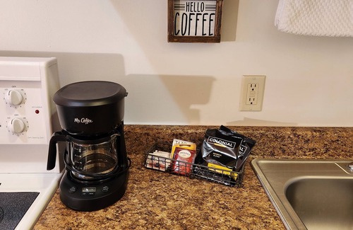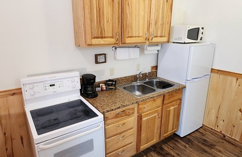 Part of Beargrass Lodging & RV Resort, this unit is part of a fourplex building. Unit #10 is a studio layout with 1 King bed and couch in the living room. Full kitchen with dining table/four chairs. Dishes, pots and pans provided. Basic pantry supplies includes salt, pepper, sugar, cooking spray, foil, plastic wrap, tea, coffee, and coffee filters. Full bathroom with tub/shower. Highchair and pack-n-play available upon request. Room is NOT pet friendly.