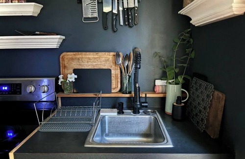 We have been restoring this very cool historic house and are finishing the details up now. More photos will be available soon. Please feel free to reach out with questions. This unique place has a style all its own. Just across the street from the dreams park, "the Gallery" apartment has a private bedroom with a small kitchen and bath, but a large living room that converts to sleep 4 extra people.