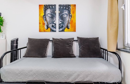 The studio apartment "Chalé Do Vale - Black and White" is situated in Pinhal Novo and offers a welcoming and enjoyable space for your getaway. The 2-storey property consists of a loft-style living/sleeping area, a fully-equipped kitchen, and 1 bathroom, and can accommodate 4 people. On-site amenities include high-speed Wi-Fi (suitable for video calls), a TV, a fan, and a capsule coffee machine. A baby cot is also provided, and a laundry area is available outside the building.