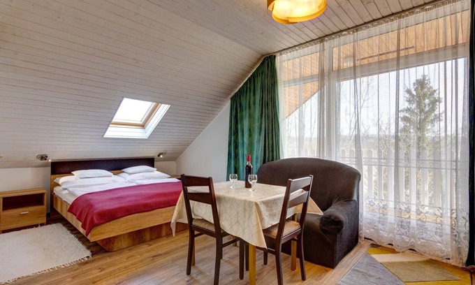 Our courtyard-facing rooftop studio apartment on the second floor is suitable for 2 people with bed- and livingroom corner, kitchen corner, bathroom and courtyard-facing panoramic balcony. It can be expanded on request (+30m2) with one more bed- and livingroom corner, bathroom and panoramic balcony, so it is also suitable for up to 3-4 people. (Extra bed: available, air conditioning: available) In the rear yard parkplace for your car, grape arbour and sunbath terrace usage for your resting.