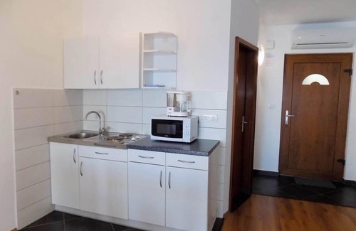Fully fenced property: yes, Height of the fence: Studio Apartment 4(2+1) consists of one bedroom (double bed), kitchenette and bathroom with shower. The apartment have a balcony with external garden armchairs and beautiful sea view, air conditioning with possibility of heating (winter season), modern satellite LED TV, wireless internet connection and parking place. There is a possibility of extra bed.