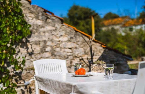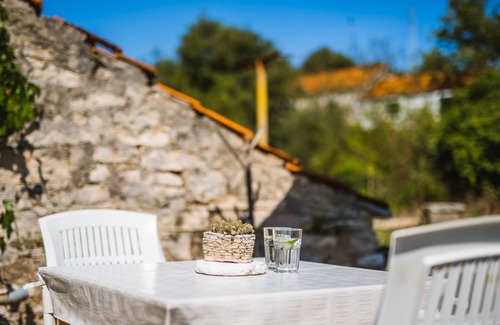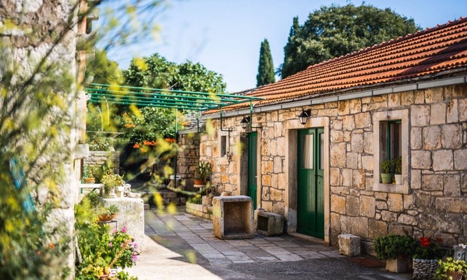 Charming typical Dalmatian property with village charm in Zrnovo, 2.5 km from Korcula town. Set within a centuries-old village landscape with old stone houses, old village streets, this quiet property offers a studio apartment and a small 2-storey cottage for all-round use. Especially the picturesque garden with various Mediterranean plants, colorful flowers, garden furniture and a vegetable garden impresses with its authenticity, Wi-Fi is free. The air-conditioned studio is suitable for 2 persons and is located on the ground floor. It has a double bed, ene mini kitchen, a private bathroom with shower, a separate entrance and a nice terrace, partly covered. The cottage is also air-conditioned, has 2 separate bedrooms, a bathroom with WC and shower, a spacious living room and a garden terrace. The nearest beach in Zrnovska Banja is barely 2.5 km. Extensive sandy beaches are located in the 8 km distant Lumbarda.