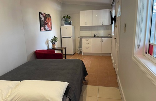 This self contained studio apartment has its own private entrance, air conditioned, kitchen with cooking features, en-suite bathroom, double bed, wifi and outdoor seating. This studio is ideal for the single traveler or those needing a safe pet friendly apartment (please advise type of pet) Minutes to ocean beach, cafes and restaurants.