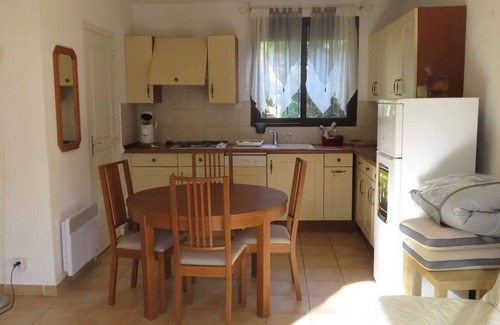 Studio-type house of 27m², air-conditioned, sheltered under the pines, benefiting from a garden and a furnished outdoor terrace. It is equipped to accommodate 4 people (1 BZ and 1 convertible), a kitchen area with table, a large fridge/freezer. A bathroom with toilet and a washing machine. Access to the beach (400m), tennis courts (50m) and the supermarket make this studio the ideal place for a car-free vacation. Animals admitted under owner agreement.