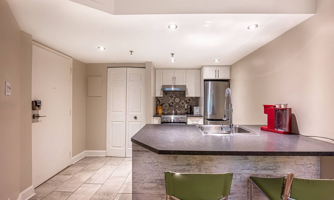 Au cœur du village de Saint-Sauveur, beau studio très grand lit, cuisine complète, table diner, petit salon & terrasse. Salle de bain avec douche moderne, accès par ascenseur. check-in sans clef avec code d'accès et internet haute vitesse. La chambre est dans le même stationnement que le centre hôtelier. à quelques minutes de marche de tout les centre de magasinage, ski, événements et restaurants. La cuisine complète avec micro-onde, ainsi que machine à café Keurig. C'est la chambre idéale pour un couple en vacances ou personne en affaire ou visite.