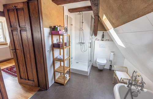 Excursion possibilities : Enjoy your stay in our old farmhouse and take the opportunity to visit the marvellous Palatinate with all its nearby attractions, for example -Hambacher Schloss, Neustadt-Hambach -Schloss Villa Ludwigshöhe with painting exhibition, Edenkoben -chairlift to Rietburg Castle, Edenkoben -Imperial Cathedral in Speyer -Trifels in Annweiler -Saltworks & largest barrel, Bad Dürkheim -Festival complex in Germersheim -Recreation in the Felsenbad Dahn -Wellness in the Binshof, Speyer If you like extensive hiking, this is the place for you: The Palatinate Forest is the largest contiguous forest area in Germany! There are beautiful little huts and nature lovers' huts everywhere, inviting you to enjoy a glass (or several) of wine and a traditional snack. Immediately afterwards, you will be travelling to Alsace, which has more than just a linguistic connection with the Palatinate.