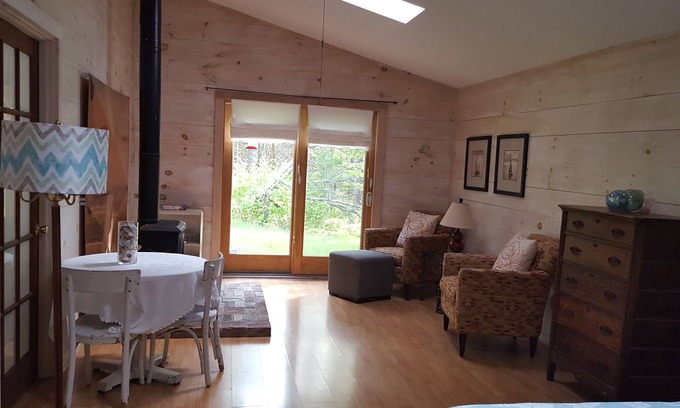 The Guest Studio is inside my home and totally private with several rooms and spaces between the Studio and shared kitchen and bathroom and owner's room. There is a private entrance to studio from outside. There seems to be a bit of confusion this year as inquires have been about a cottage. I have had the same description for 8 years...I call the space a "Studio" as it is two rooms combined, but open. The Studio living room is at one end of the studio with a gas Jotul stove for cool nights and Queen bed at the other end, and skylights. The pictures are very accurate. There is a window air conditioner, ceiling fan and sliding doors with a screen.