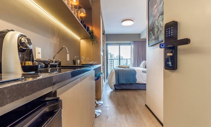 Close to the subway, airport, hospitals, shopping malls, famous brand stores, trendy cafes and restaurants in the Moema neighborhood, you will find plenty of practicality to enjoy São Paulo, with modern, comfortable and well-designed decor. With the best cost/benefit, you will be in a new space with a Queen bed, kitchen equipped with cooktop, minibar and microwave, work bench, super-fast internet and much more in 24 m² with a communal area and several leisure.