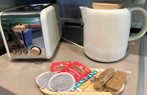 The kitchen is equipped with an oven, a stovetop, and a refrigerator, as well as a coffee maker, an electric kettle, and a lobster pot. Enjoy the free WiFi and TV. Bathroom amenities include a hair dryer, towels, and toilet paper.