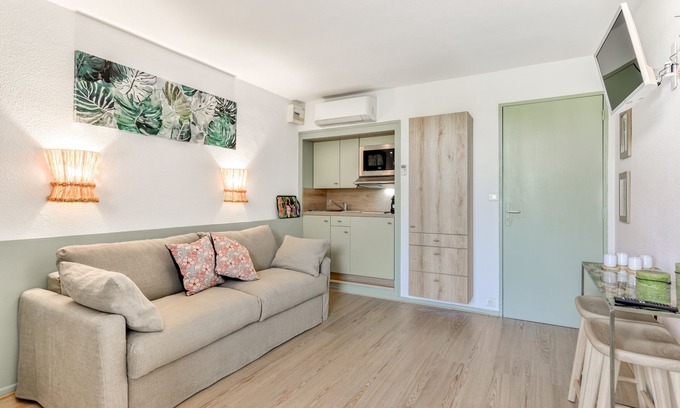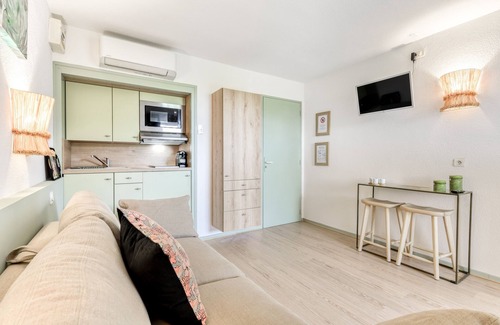 Cocoonr/Book&Pay Agency offers you, in Saint pierre la mer, this beautiful air-conditioned studio at the foot of the beach, less than 100 m from the beach, with an area of 18 m² and can accommodate up to 2 travelers. Located on the 1st floor (no elevator), it comprises an attractive 18 m² living room, a fully-equipped kitchen and a bathroom.