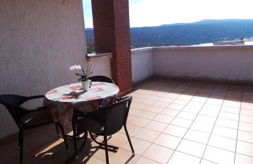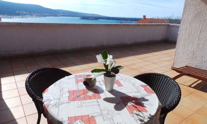 The studio is located in a detached single-family home and is furnished in a typical country style. The property is located at the end of a cul-de-sac road. Also due to the view over the sea from the property and its quiet and sunny location the domicile is popular. Available for shared use: garden shower, barbecue facilities, terrace and garden furniture.LocationKornić. The landlord lives permanently in the house, but uses a seperate entrance. Parking is available on the property. Specialair conditioning.Facilities: internet access (WLAN). TV reception takes place via satellite. Dogsnot allowed. DistancesShopping 500 m, restaurant 500 m, town center 500 m. Krk 4 km. In summer: Adriatic Sea 600 m (beach 600 m featuring gravel, rocks and bathing plateaus). diving, boat rental each 800 m. Nudist beach 1500 m. Sandy beach at Punat 2 km. Nudist beach Politin 2 km.Wasserski and volleyball 800 m. DivisionStudio, 1 floor, 1 room, 22 sqm, in total 2 beds. RoomThe entrance to your studio is located on the 2nd floor and leads directly into the living & bedroom. Living/bedroom with 1 double bed, TV, dining area, access to the terrace (garden furniture) and sea view. Kitchenette in the living & bedroom with electric stove (2 plates), fridge (icebox) and coffee machine. Bathroom with shower, 1 washbasin and WC. Terms of lease and pricesIncluded in the priceinternet access, air conditioning, parking place, electricity, gas, water, final cleaning, bed linen, hand towels, Welcome drink, Wireless Internet access. Side costs-Additionally(Payable when booking)/local tax.Costs on the spot:/On request: For a fee: boat trip.Deposit:EUR 150,-/object