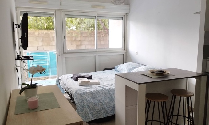 Studio near Montpellier/Plage is located in Aiguerelles. Studio near Montpellier/Plage provides accommodation, featuring Security/Safety, Bedding/Linens, Fireplace/Heating, among other amenities. This Apartment features Security/Safety, Bedding/Linens, Fireplace/Heating, to make your stay a comfortable one.