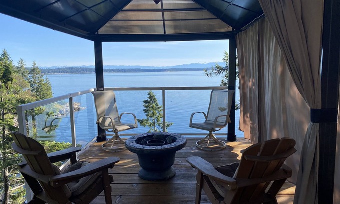 Your stay will be a true West Coast experience with spectacular ocean and mountain views with little to no outdoor light pollution other than the natural skyline and layers or horizon. Located directly across from beautiful Savary Island and looking directly at the sandy beaches from the private 220 square foot studio. The park area on the property includes; Gazebo, propane fire pit, chairs, picnic table and propane grilling station. Please note there are 26 stairs from your parking spot in the carport to the Studio, and an additional 41 stairs to the park area.
