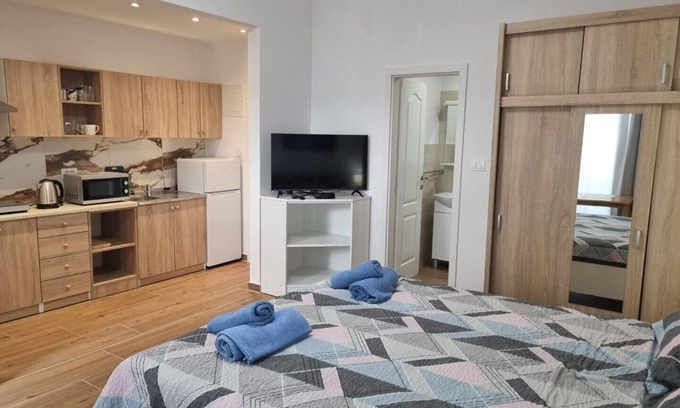 Studio apartment in a great location in Poreč. It is located 350 meters from the city beach and 500 meters from the city center. The apartment is only 2 km from the Aquacolors Poreč water park. If you are looking for a quiet place, and at the same time to be in the center of events, studio apartment Raven is a great choice. Located in the very heart of Poreč, this facility offers an excellent location. Nearby you can rent bicycles or enjoy excellent restaurants. You can ride a small tourist train to the Green or Blue Lagoon. There is free street parking near the apartment. We recommend it for couples or families with a child up to 12 years old.