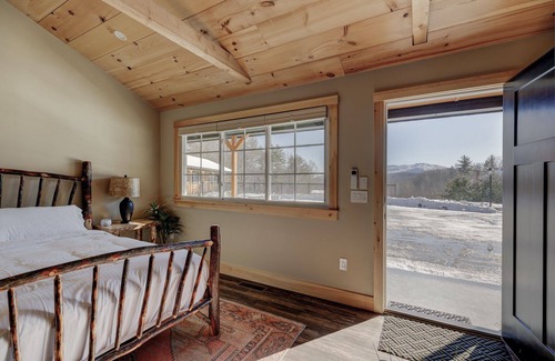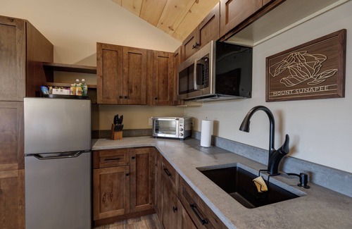One of 11 luxury rooms at the Lodge by Sunapee Stays, nestled in Sunapee with spectacular views of Mount Sunapee just out your front door. This modern rustic studio room features hickory log furniture throughout, king bed and full size memory foam sofa bed. The kitchenette is fully stocked with all the amenities to eat in. The bathroom boasts a sanctuary of it's own with pebble stone shower surrounded by subway tiles and your very own bidet toilet! The shiplap vaulted ceilings and plush Adirondack style furnishings evoke relaxation after your day of adventures. The Lodge offers a common indoor lounge area featuring contemporary and classic family games along with a TV. Outside you'll find a semi private patio complete with rocking chairs and a seasonal outdoor pool with a views of Mount Sunapee!