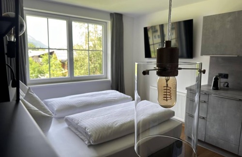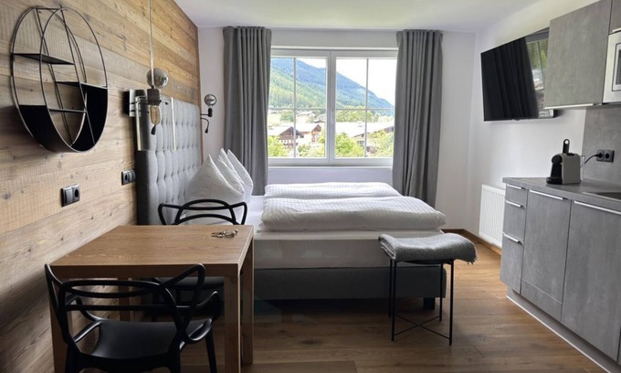 Cozy studio with double bed, kitchenette, dining table, shower and toilet, hairdryer, guest supplies, flat screen TV, safe, free W-Lan,