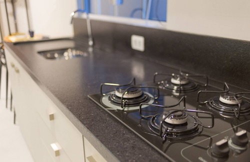 - Cozinha equipada com utensílios e eletrodomésticos para preparar e servir suas refeições: fogão cooktop, geladeira, cafeteira e sanduicheira;