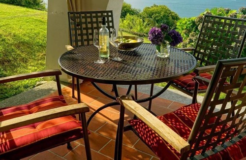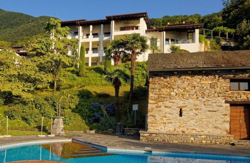 The flat in Casa Aurelia is part of a well-maintained holiday residence. Six houses are generously spread out on a lushly planted hillside plot of around 16,000 square metres. As the holiday flat is on the ground floor, you can also sit on the large terrace surrounded by greenery, directly between palm trees and flowering shrubs. Under the cosy round arches, you can enjoy the lake and mountain panorama from outside in almost any weather. And in summer, the evening sun shines on our terrace for a long time while the opposite side of the lake with Locarno and Ascona is already in the shadow of the mountains. This is how you live: