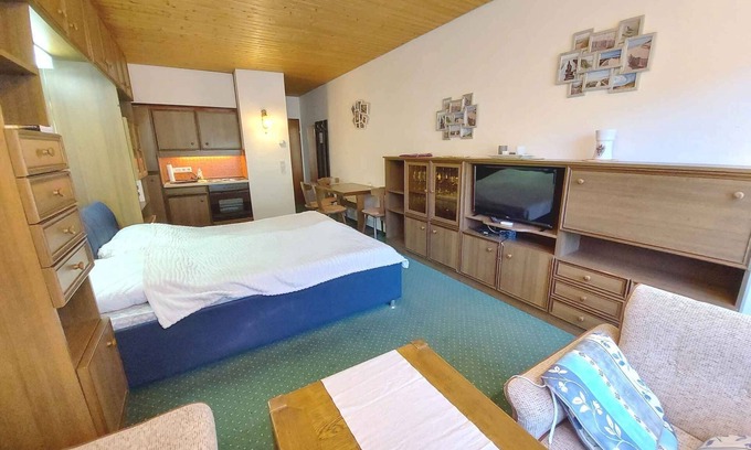 a double wall cupboard bed and a double couch. Cooking nook in the living & bedroom with TV, dining area (3 seats), electric stove, extractor hood, fridge, microwave, coffee machine, toaster and electric kettle. Bathroom with bathtub with shower facility, 1 washbasin and WC. Credit cardsVisa, MasterCard, Eurocard. Terms of lease and pricesIncluded in the priceIndoor pool, sauna, ski bus, parking place, sauna, electricity, water, heating, local tax (under 15 years), indoor swimming pool, Ski bus (30.11.25-31.03.26), Wireless Internet access. Side costs-Costs on the spot:/Obligatory:registration fee 50 € per object per stay. final cleaning 60 € per object per stay. laundry package (bed linen, hand towels beach towel) 25 € per person per first time use and changing. local tax by local tariff.Deposit:No deposit.