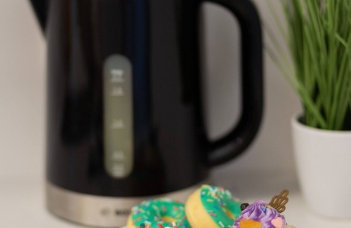 Electric hob, dishwasher, fridge with freezer, electric kettle, microwave, cutlery, crockery, pots, pans