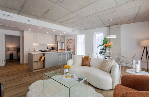Unwind in style at this bright and modern 2-bedroom apartment, tucked into the heart of Old Montreal, just a 3-minute walk from Place-d’Armes metro station. With its private balcony, Smart HD TV with streaming, and in-unit washer & dryer, this apartment blends comfort and charm—perfect for a weekend escape or extended stay.