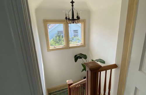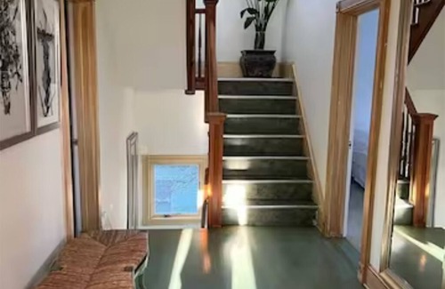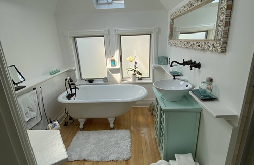 The home occupies the second and third floors of a nearly century-old residence that has been lovingly remodeled to preserve its historic character while offering all the comforts of modern living. Each bedroom includes its own television, small refrigerator, and closet, while the attic features two walk-in closets illuminated by skylights. The upstairs bathroom, complete with a beautiful clawfoot tub and skylights, is bright and serene—a perfect place to unwind. Central heating and air conditioning ensure a comfortable stay in every season.