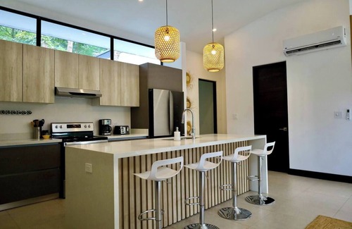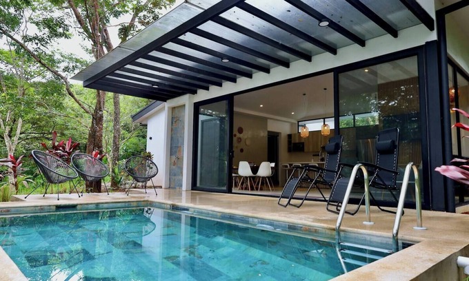 Welcome to LA JUNGLITA... A brand new custom home that overlooks a jungle of tropical gardens while you relax in our PRIVATE lounge pool. Located within a 24/7 secured gated community, you also have access to a fully equipped gym, tennis courts, & a 3-tiered waterfall pool. Our community is just over a 1.5 mile walk from Playa Junquillal; a long powdery dark sand beach featuring the wonderful sea turtle hatchery, VerdiAzul. See for yourself why we call this oasis: A Crazy Monkey's Paradise! La Junglita is a 1400 square foot custom built bungalow that sits on 1.25 acres of lush Costa Rican land. It resides on one of the 75 lots within the gated community of Tierra Pacifica complete with on-site security 24/7. The home was built in an open concept manner to maximize time spent with the ones you love. A fully equipped kitchen with stainless steel appliances and large island with bar stools face both the dining and living areas. The living room sofa changes to a king size pull out mattress with a luxury mattress topper to make your stay even more comfortable. All three bedrooms are furnished with queen size beds and night tables. The main bedroom has an ensuite bathroom connected via a large walk-in closet while the other two bedrooms have large built in closets and share the second bathroom. All rooms and the main social area are equipped with individual air conditioners. The outdoor space of the villa is the highlight of your stay. A beautiful lounge pool that looks out to the lush gardens surrounding you makes you think you are the only guests within miles and miles. Pool chairs and loungers, an outdoor shower, Blackstone BBQ grill, and pool toys are just a few of the things La Junglita has to offer. As Costa Rica is a tropical country, you will encounter insects and other small anthropods that may enter the home. We fumigate on a consistently timed basis and while this does help, it does not completely eliminate all the bugs that enter. Guests may escort out any insects with a broom and dustpan provided. La Junglita is a place for nature lovers where you be immersed in the sights and sounds of many different species & walks of life. If you have always wanted to see a howler monkey, look no further. We have several families that visit our exotic trees almost daily. The entire property of La Junglita is yours to use and can be accessed via a key code at the front entrance that will be given to you prior to checking in. In addition, as guests of La Junglita, you are also guests in our gated community meaning you have access to the amazing pool, fully equipped gym, and social areas of Club Arbol during your stay. A basketball court, tennis court, yoga/stretching room, and nature trails are also yours to discover throughout the Tierra Pacifica community. Identification will be required at the entrance gates of Tierra Pacifica where security will greet you and verify your stay. The area of Junquillal is quieter and more quaint than those looking for the hustle and bustle of Tamarindo but only 30 minutes from the action if you wish to experience it as well. There are several local restaurants, small grocery stores, and pristine beaches in and around the neighbourhood. There are some small hills throughout the area that can make for beautiful walks. A car rental is recommended to experience all of what Costa Rica has to offer. We love our Junglita and it was a dream come true building this for our family and friends to enjoy. We hope that you, as our guest, will treat our home and property with the same utmost care and respect that we have in creating our dream. Hosting is something we have never encountered before and are learning along the way. Although we are trying to tick all the boxes to make things perfect, we will undoubtedly not achieve perfection now or ever. We value any ideas or suggestions during your stay from the time of booking until the time you leave, so please do not hesitate to reach out to us directly with the email provided at check in.