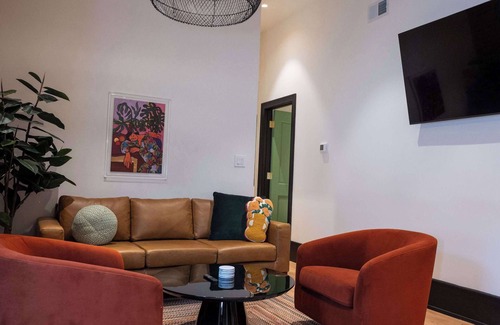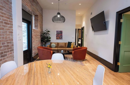 Experience New Orleans charm and modern luxury in this vibrant, 4-bed, 3-bath suite. Situated on the famous St. Charles Avenue streetcar line, 1.6 miles from the French Quarter, and Downtown. Beautifully renovated historic building with exposed brick walls, high-end finishes, and bold colorful design. This property brings the spirit of New Orleans to life. Spacious living room, fully equipped kitchen, and everything you need for your stay. Outdoor pool with turf, courtyard games & grill.
