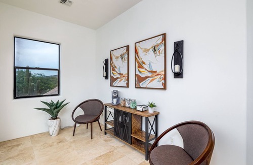 Experience the Sonoran desert like never before! The private grounds are professionally landscaped with stunning native plants and accented with custom metalwork. The luxurious heated pool features a Baja with in-water lounge chairs and a separate spacious spa with jets. The outdoor space includes a large firepit, cornhole game, dining table, ample outdoor seating, and an outdoor barbecue.