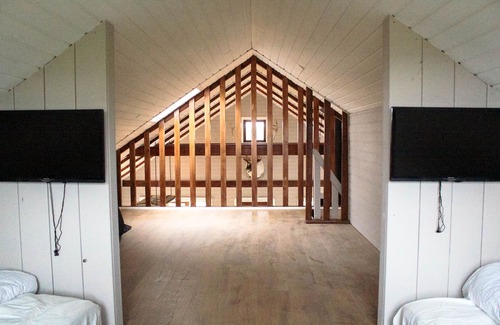 On the UPPER FLOOR are two 200x120cm beds and two 22“ TV's that are equipped with hundreds of MOVIES. There are also two COMFORTABLE BEAN BAGS.