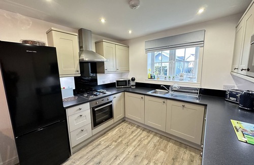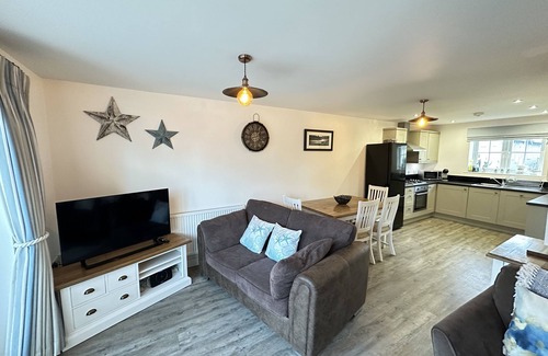 Enter through the step free doorway into a generously proportioned hallway with cloakroom. Walk into the 'L' shaped open plan living, dining and kitchen area with sofas for 6 and SMART TV with stunning bi-fold doors across the rear of the property to a private furnished patio, ideal for outside relaxing with seating for 6 with lawned area In the dining area there is a dining table for 6 which leads into a modern fully equipped kitchen including a 2 fridge freezers, dishwasher, washer-dryer, 2 microwaves as well as an electric food steamer, slow cooker and Tassimo Coffee Machine (bring your own pods).
