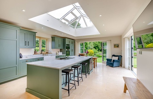 French doors to the garden, central island with three bar stools, two electric ovens, induction hob, fridge with large freezer drawer, wine fridge, microwave, dishwasher, kettle, toaster, Nespresso coffee machine, four-seater dining table, armchair, Apple HomePod and Smart TV with Sky and apps