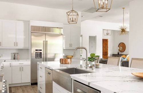 The expansive kitchen opens to the backyard and is equipped with nearly every gadget you could imagine. A viking stove and oven make cooking for all occasions a pleasure. Two refrigerators and an open pantry ensure plenty of storage for your entire party.