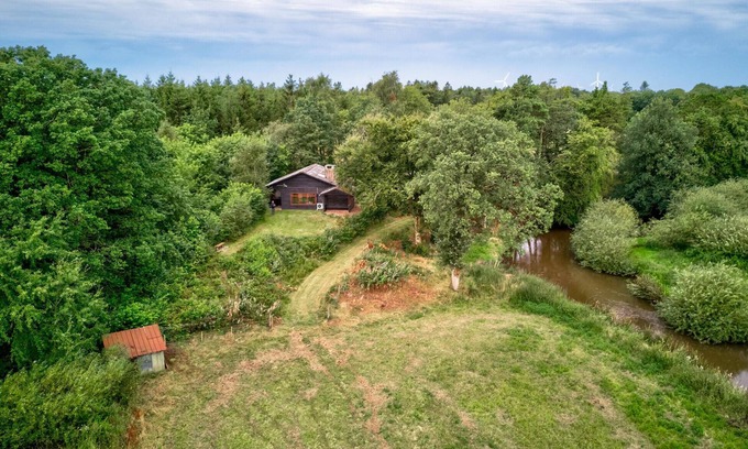 The vacation home is located in a small forest, through which the Storeåen river meanders beautifully right in front of the house. Make yourself comfortable in the house and enjoy the view of nature through the large panoramic windows. The homely atmosphere and cozy furnishings complete the offer of the house and create a cozy home.