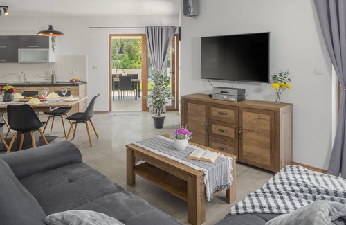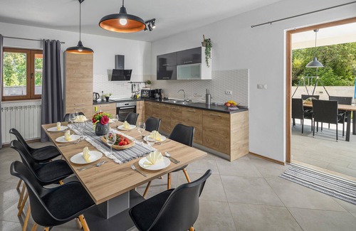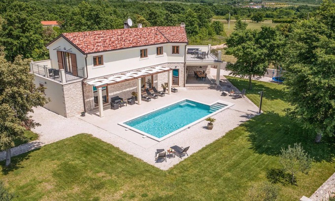 In a quiet location, this wonderful holiday home with pool offers plenty of privacy for a relaxing holiday with family and friends. The spacious holiday home offers its guests plenty of comfort and consists of four bedrooms with en-suite bathrooms, living room, kitchen and dining area as well as direct access to the terrace and pool area. The terrace is covered and has an outdoor kitchen where you can also prepare delicious meals outdoors. On the upper floor there are two further terraces with views of the surrounding greenery. The first beaches can be reached in about ten minutes by car. Visit the enchanting town of Rovinj with its church of St Euphemia, but the small town of Bale also exudes a special charm and is well worth a visit. There is a large, salt-treated pool on the property where you can swim and relax.