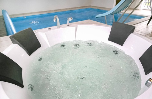 Spend a relaxing holiday in this holiday home, which is specially designed for larger families or groups of friends. Look forward to a well thought-out room concept, plenty of space and a variety of leisure activities, ideal at any time of year. Step into the open-plan living area with high wooden ceilings, wood-burning stove and several cosy seating areas. Play a game of table football, billiards or table tennis together in the activity room or enjoy being together at the long dining table. Prepare your favourite dishes in the modern kitchen or relax in the whirlpool after a dip in the pool with slide. There is also a sauna at your disposal.