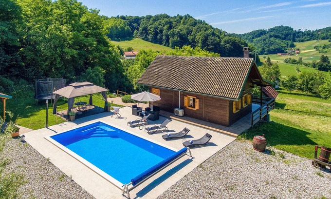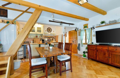 Near the spa town of Krapinske Toplice, you will find this original wooden holiday home, which carries a part of its ancient history within it. A beautiful garden adorns the log cabin, which is nestled in the middle of pastures and meadows near a forest. The tranquillity of nature and the chirping of birds are ideal conditions for a relaxing holiday. Next to the house there is a lovely terrace, a swimming pool and an outdoor kitchen where you can use the barbecue to prepare your favourite meals. In front of the house there is also a covered terrace where you can enjoy your meals with a view of the unique landscape and the hills of Zagorje. On the ground floor there is an open-plan kitchen with dining area and living room as well as a bathroom, while upstairs there are 2 bedrooms, the second of which is a connecting room. The holiday home is ideal for families with children.