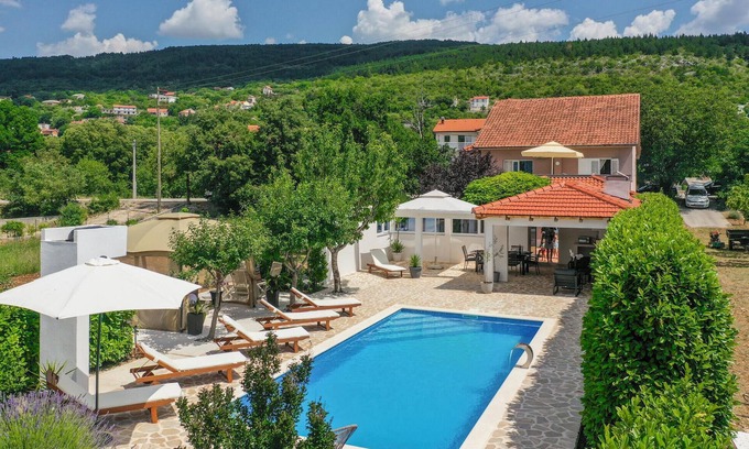 This beautiful vacation home is located in Prolozac Donji, near the town of Imotski. It is modernly furnished and sufficiently equipped. The house consists of two residential units with external connection. In the back of the cottage there is a room with billiards, table soccer and table tennis, where you can have fun while the little ones enjoy the children's pool with hydro massage jets.
