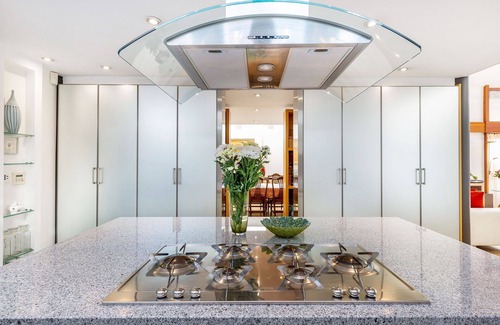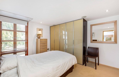 As featured in `25 Beautiful Homes’ this unique home of magnificent symmetry and light was considered by the architect to be his best design. From the outside, it could be a small modern mews house, but when inside the octagonal hall looking up you can see a Juliet balcony, three large circular internal windows and the sky through two large skylights and . The two downstairs front rooms are a guest bedroom and a study and there is a cloakroom/wet room off the hall.