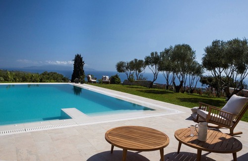 Every aspect of Villa Ylenia, from its design to its furnishings and decor, has been meticulously crafted to the highest standard of luxury. This results in an extraordinary villa holiday experience that exceeds expectations. The villa's architecture has been purposefully designed to maximize the surrounding panoramic views, featuring expansive windows and patio doors that frame the pool, gardens, and the neighboring island of Zakynthos.