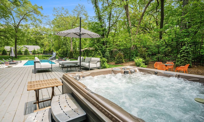 Beautifully nestled on a three-quarter acre lot near the shores of Lake Michigan, treat yourself to a peaceful lake getaway with this Grand Beach home! Boasting lavish amenities and room for the whole family, spend your days next to the private pool (with a slide) or stargazing from the hot tub. The lovely outdoor space also features a comfy firepit area, grill, lush lawn, expansive porch, and yard games, creating the perfect backdrop for spending time with loved ones in the warm sunshine. There’s even a golf cart available during the summer! When looking to explore, you’ll find Woodlands Course at Whittaker, Friendship Botanic Gardens, and Washington Park Beach & Zoo all within about nine miles.