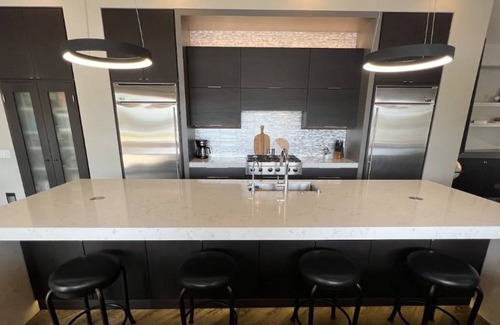 The home’s open design is not only inviting but functional as well. The spacious gourmet kitchen is fully stocked with everything you need to enjoy your stay. With expansive quartz countertops (13’ island), top of the line stainless steel appliances, GE Monogram refrigerator and separate sub-zero freezer, gas cooktop, double convention ovens, this kitchen is a dream!