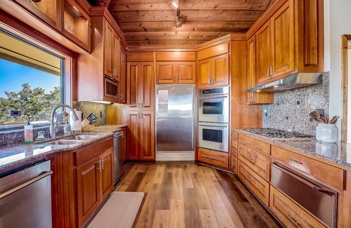 Inside, you’ll find a unique, open layout with soaring, wood-paneled ceilings, hardwood floors, stone accents, and stylish, Western-modern decor. The sparkling chef’s kitchen features everything you need to fix a feast, including a double oven, free-standing ice maker, five-burner cooktop, dishwasher, Subzero refrigerator, and a full-sized freezer, with enough cooking and serving pieces to easily feed a group of 16. Two dining tables, a breakfast bar, and a patio table all offer plenty of mealtime seating.