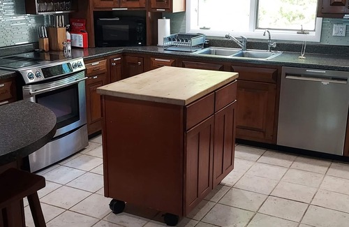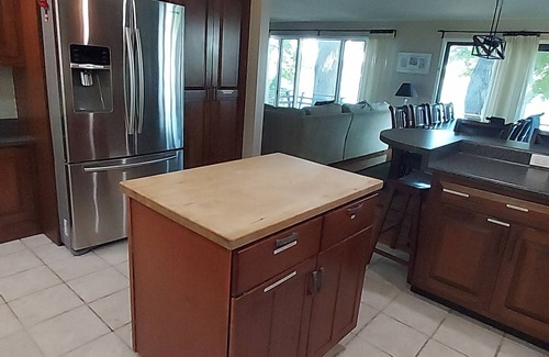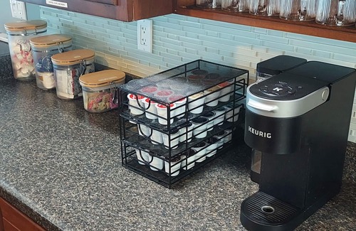 The main kitchen (another kitchen is in the in-law suite) features high-end appliances, including a "french door" Samsung refrigerator/freezer, an electric range/oven, dishwasher and microwave. A second full-size refrigerator/freezer is on the in-law suite floor. The main floor kitchen features a large array of cookware, appliances, dishware (including for children), glassware, cutlery, utensils, and other amenities needed for a comfortable, lived-in feel and to meet the needs of a discerning cook. A Keurig coffee maker with a large selection of K-cups, teas, hot chocolate, sugar substitutes and various cooking staples (e.g., oils, sugar, and a full spice rack) are provided. A 3-burner propane grill is available for outdoor cooking along with many BBQ tools.