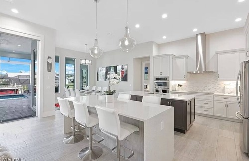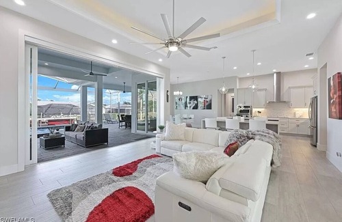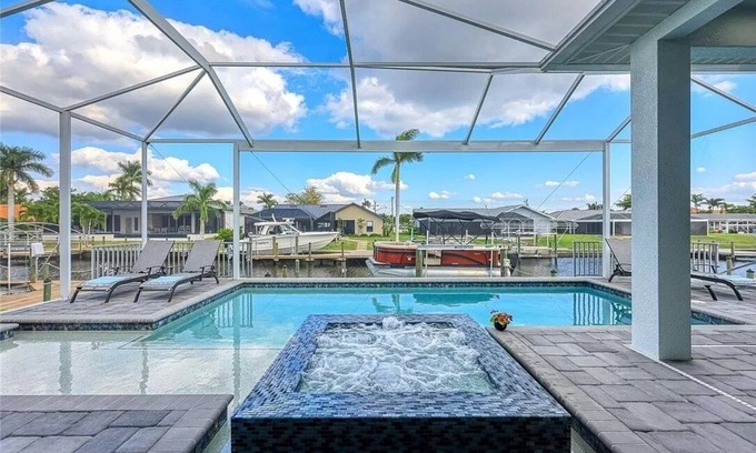 Custom built 2021 Luxury 4 BR 3 Bath, 3 car garage Villa ideally located in SW Cape between Tarpon Point/Cape Harbour Marinas and excellent restaurants all within a bike ride or Kayak. This modern direct Gulf Access Single Family Home with sought after indoor/outdoor living has four into one 10' pocket sliders, 20+' ceilings, gourmet kitchen with double islands, Electric reclining leathers couch with 85" TV. The Master Suite is your private oasis! large lanai w/ outdoor kitchen, Firepit dining table, pool, jacuzzi, and a sun shelf. Amenities include Kayaks, Cruiser Bikes, pool floaties, full dock (can park rental boat), Bar, 4 TV's, Beach gear...