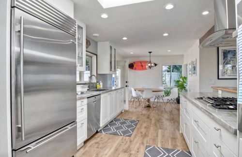 As you enter through the front gate you will walk into our private courtyard filled with succulents and palm trees, now go ahead and relax it only gets better. From the front door you step into the airy living room filled with natural light and ten foot high ceilings. This is a great central area for families, where you can play games, movies or watch football while the chefs make dinner. Our home consists of 2 bedrooms, 2.5 baths a gorgeous siting room to relax and enjoy the views or practice yoga, we also have a small kids room or nursery. This room is ideal if you have small children and need a place to do homework or just play. The kitchen was remodeled this summer (2015) and is ready for your gourmet meals or prepping your beach snacks, compete with Bosch and Sub Zero appliances. Enjoy the ocean view at the dinning table which seats 6 and the kids are always happy to sit at the bar (3 stools). In the spring, summer and fall we tend to eat on the ocean view deck and watch the sunsets or waves.. The laundry room sits off the kitchen as well. There is an office area/desk if heaven forbid you need to do a little work yet there is a great view to distract you. The downstairs is complete with 1 bedroom with ensuite full bath sitting room with stunning views and small kids room and powder room There is a bedroom with a full bath and King bed and filtered ocean views. The 2nd bedroom downstairs is truly amazing where you will be surrounded in white water ocean and coastline views to La Jolla. The french doors lead out on to the deck where the stunning views continue. If you can't get the master this is the next best thing. The final bedroom is the master bedroom which is located upstairs. We feel our master has some of the best views in Cardiff. Its the views to the South that I truly love where you see the coastline wrapping around all the way to La Jolla and the majestic Pacific ocean. Wake up and walk out on the large private deck, have a cup of coffer or tea and just breathe in the fresh ocean air. The master is complete with a shower and ocean view tub.