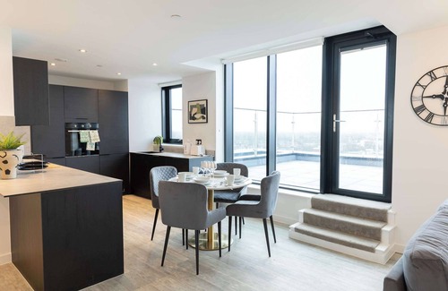 This spacious and bright interior has been finished to a high standard and features stylish furnishings and modern fixtures and fittings throughout. Situated on the 15th floor, there are large windows which fill the apartment with natural light and offer views of the city skyline. There are glass doors that provide access from the living space and master bedroom, to 2 x large terraces with views of the city, as well as Old Trafford Cricket Ground & Old Trafford Football Ground. Providing a stunning vantage point from the 15th floor, this is a beautiful spot to enjoy a morning coffee or evening glass of wine. The open plan living space comprises a modern fully equipped kitchen with everything you need to cook your own meals at home, a dining table, sofa, and smart TV. There is high speed broadband throughout the apartment. The 2 double bedrooms feature comfortable double beds made up with crisp hotel linen, as well as storage space for clothes. The master bedroom also has access out onto the balcony and benefits from an en-suite bathroom. There's also a large family bathroom featuring a shower and bathtub, along with complimentary toiletries and fluffy towels for your use. Free on-site parking is available