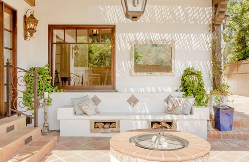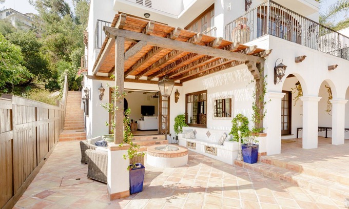 This villa sits surrounded by trees and mountain views from the living room and outdoor patios. Walk out the double french doors to a stunning outdoor large gazebo with built in benches, restoration hardware and Moroccan furniture surrounded by lavender plants and tranquility, perfect for relaxing in the sun or enjoying a glass of wine after a long day. Walk out the other double french doors in the kitchen to another patio where you fill find built in banquets for relaxing or reading in the shade. Located in the lower part of the property. This villa was just completed redone and has never been on the rental market. A TRUE GEM. Exposed rustic beams, stone arches and rustic chandeliers adorn this unit, giving you the feel of old Spain.