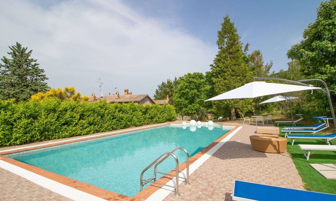 This historical country house "Il Giardino Dei Semplici" is a detached 1700s villa, renovated in 2000, surrounded by fields in the hamlet of Montelovesco, 15 km from Gubbio, Italy. It offers a shared 1 ha park and a private swimming pool (6 x 12 m, depth 160 cm) with salt water, available seasonally from June 1st to September 30th. Garden furniture and a barbecue are provided. The property has Internet Wifi and Parking amenities. A vacation rental here allows you to enjoy the scenic and secluded location atop a hill.